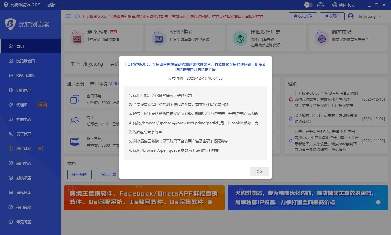 1. 优化性能,优化某些情况下卡顿问题 2. 全局设置新增自动检测系统代理配置,有效优化假全局问题 3. 修复扩展中无法删除自定义扩展问题,新增分别为指定窗口开启指定扩展功能 4. 优化 /browser/update 与/browser/update/partial 接口中 cookie 参数,允许传数组或者字符串 5. 浏览器窗口新增【显示账号平台的用户名及密码】权限控制 6. 优化 /browser/open queue 参数为 true 时队列控制