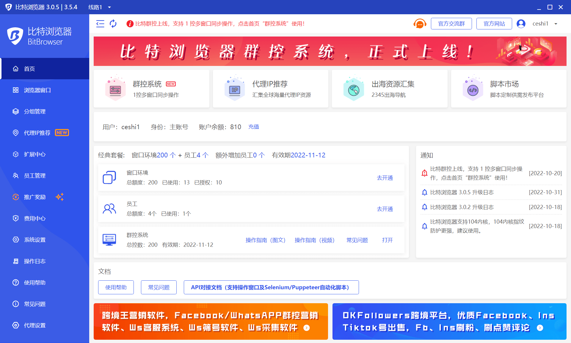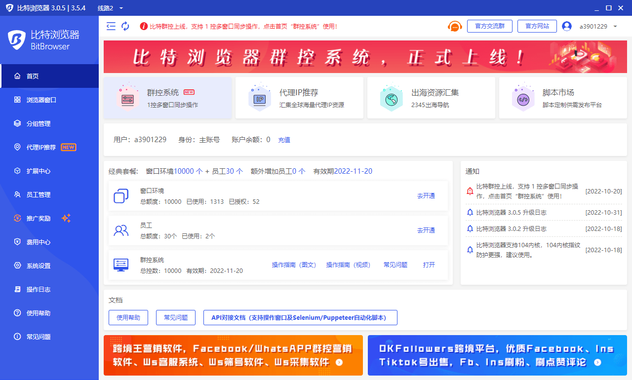 1. 全新发布群控系统,支持 1 控多窗口同步操作 2. 客户端新增 32 位版本,支持 32 位系统使用 3. Local Api 固定端口,并支持修改,且兼容旧版读配置文件方式获取服务端口 4. Local Api 打开窗口/browser/open 接口新增 extractIp 参数,设置为 true,则启用尝试自动提取 IP 5. 新增 Luminati 静态检测代理渠道,修正检测结果 6. 优化其他架构与性能