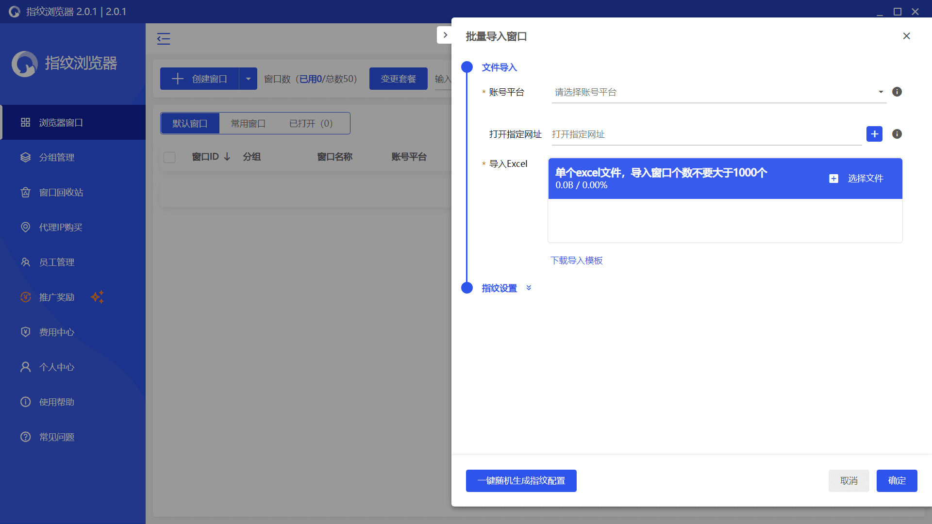 打开客户端 - 点击左侧菜单浏览器窗口 - 点击创建窗口按钮右侧的V图标 - 点击批量导入窗口 进入批量导入窗口页面,如下图所示: 账号平台:这里为必选项,选择指定的平台网址后,以后打开该浏览器窗口,将自动打开该平台地址,并将导入窗口模板中的用户名、密码自动填充进入登录页面,免输入,提高工作效率;若是列表中没有想要的平台网址,可以选择最下面项其他平台